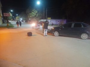 El accidente de tránsito ocurrido anoche, en la intersección de calles General López y Hermana Carina, donde colisionaron un automóvil y una motocicleta.
