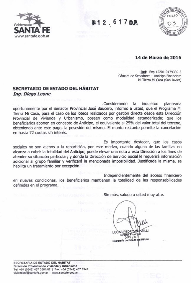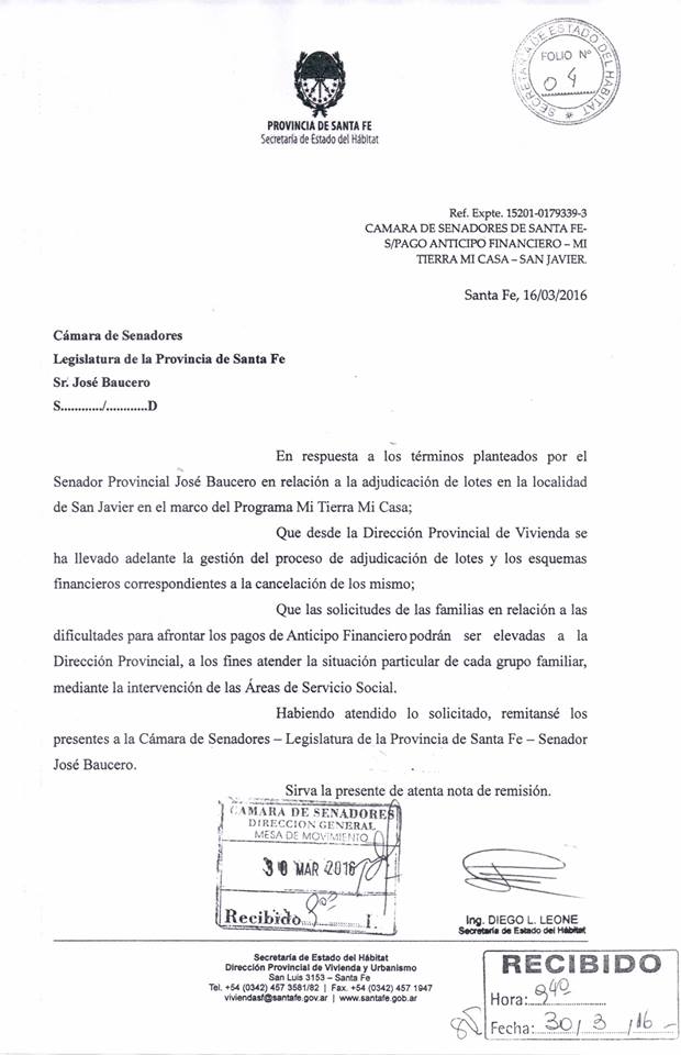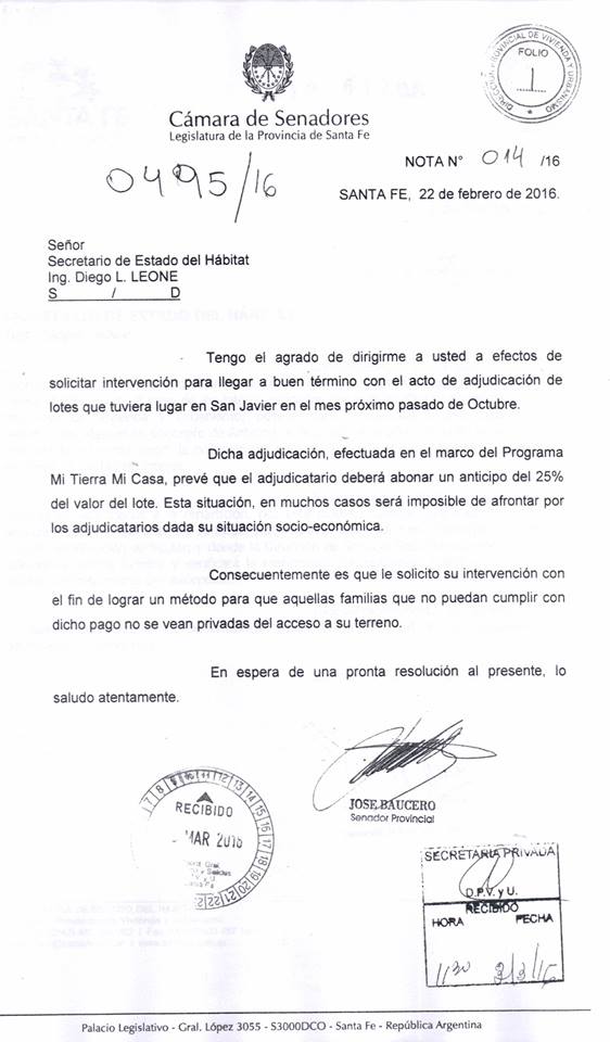 Baucero - esc 436Mi tierra mi casa 1Preocupación de Baucero por los adjudicatarios de los terrenos del programa “Mi tierra mi casa”. El senador Baucero preocupado por los adjudicatarios de lotes en el marco del programa “Mi Tierra Mi Casa”, le presento una nota al Secretario de Estado del Habitad Ing. Diego Leone.