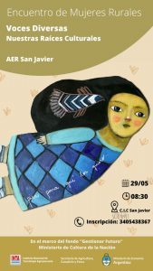 La Agencia de Extensión Rural (AER) del INTA San Javier se complace en invitar a todas las mujeres rurales de la región al próximo encuentro que se llevará a cabo el día 29 de mayo en las instalaciones del Centro Integrador Comunitario (C.I.C) de San Javier.