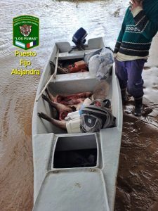 Personal de la Guardia Rural Los Pumas, puesto fijo Alejandra, realizando patrullajes preventivos en zona ribereña, identificaron dos hombres mayores de edad, quienes transportaba varias piezas ictícolas de las especies Surubíes Pintados, Bagres Amarillos, armados y mandubí producto de la pesca, también proceden al secuestro de tres (03) carinchos.