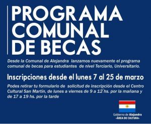El Gobierno de Alejandra informa que están abiertas las inscripciones para las Becas Comunales destinadas a estudiantes para el período 2022.