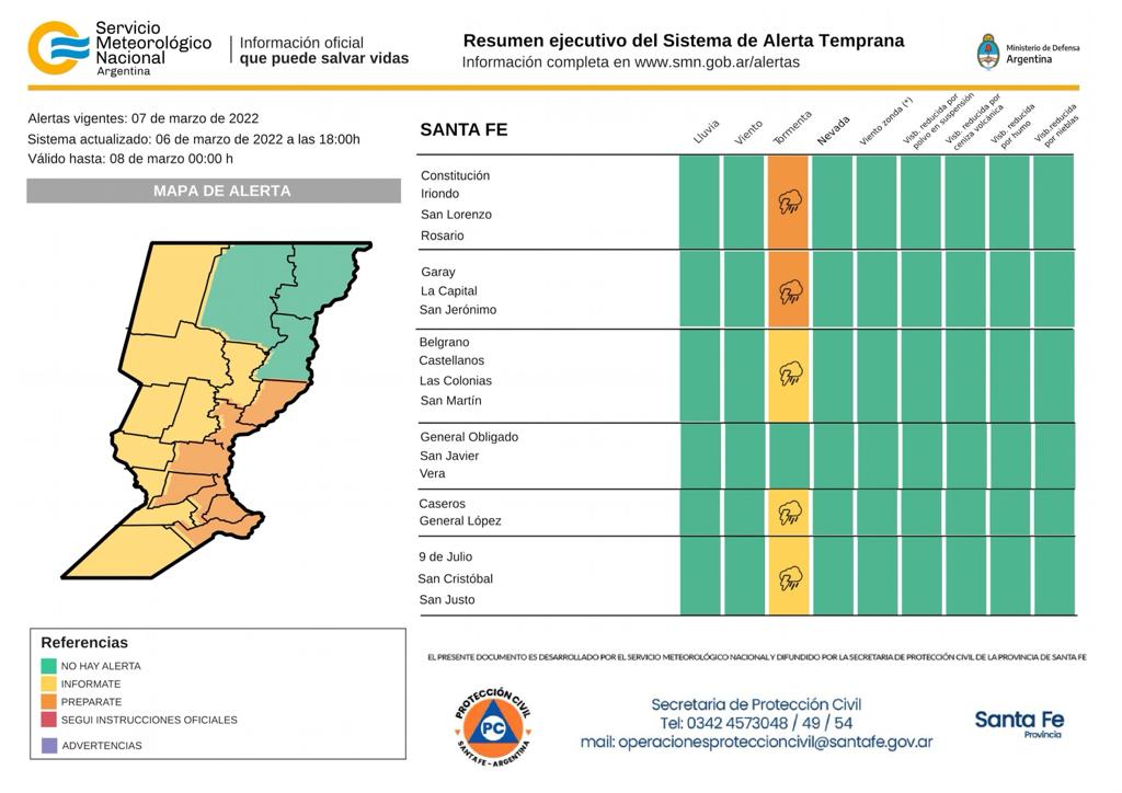 Según el organismo, rige un aviso que es de nivel naranja para la madrugada y nivel amarillo para la mañana de este lunes 7 de marzo, en varios departamentos de la provincia de Santa Fe.