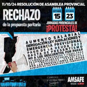 La Asamblea Provincial de AMSAFE definió este viernes 11 de octubre por amplísima mayoría, con el voto de más de 21.789 compañeros y compañeras, de los cuales 20.395 fueron por el rechazo de la propuesta que hiciera el Gobierno de la Provincia en el ámbito de la Paritaria Docente.