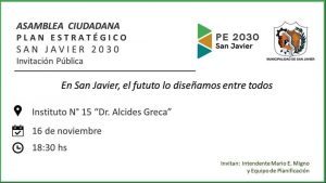 La Municipalidad de San Javier avanza en la construcción, armado y diagramación del Plan Estratégico 2030, consistente en la recopilación de ideas, puntos de vista y opiniones acerca del futuro para la ciudad. Bajo el lema de escuchar, encuestar y proponer soluciones colectivas, se hará una Asamblea Ciudadana en el Instituto N°15 “Dr. Alcides Greca”.