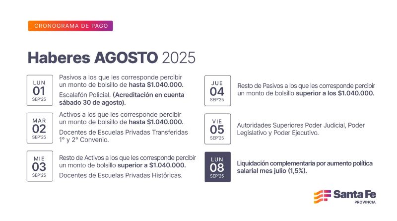 Leer másComenzará el lunes 1 de septiembre y se completará el viernes 5, incorporando el aumento acordado en paritaria para agosto.