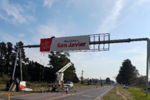 Esta mañana, el personal de la Secretaría de Obras y Servicios Públicos de la Municipalidad de San Javier continuó con la instalación del nuevo pórtico en el acceso sur de la ciudad, ubicado en la ruta provincial N° 1. La obra forma parte de un proyecto de actualización de la señalética vial, que también incluyó la reciente colocación del pórtico en el acceso norte.