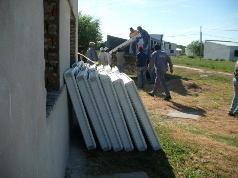 Las externas son de aluminio de primera calidad y las internas de madera con excelente terminación, en consonancia con las casas, en las que se utilizan materiales de gran calidad: paredes de 30 cm de espesor, 2 dormitorios, cocina comedor y baño. Las viviendas ya están techadas y revocadas con el contrapiso terminado y en los próximos días se comenzarán a instalar las aberturas.