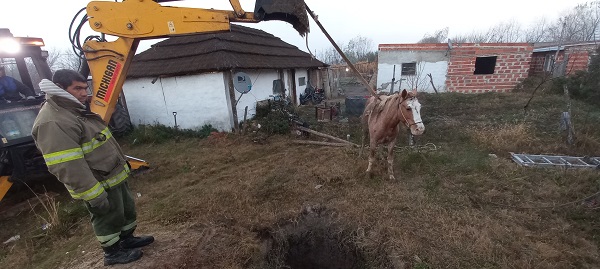 La primera actuación se registró alrededor de las 5 de la madrugada, cuando una vecina se presentó en el cuartel solicitando ayuda para rescatar a un caballo que había caído en un pozo en desuso. Dado lo complejo de la situación, fue necesario solicitar colaboración a la Municipalidad, que facilitó una máquina retroexcavadora para asistir en las tareas de rescate.