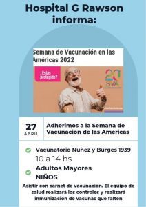 El hospital G Rawson se une a esta iniciativa regional; junto a la Región de Salud Santa Fe, organizando en el territorio actividades que visibilicen el trabajo diario de cada vacunatorio, llamando a la concientización de la importancia de la vacunación, realizando actividades de promoción e iniciando o completando esquemas de vacunas de la población en general apuntando a los adultos jóvenes y mayores de las comunidades.