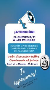 El Instituto de Educación Superior N° 15 «Dr. Alcides Greca» invita a la Jornada de difusión de carreras de la Institución.