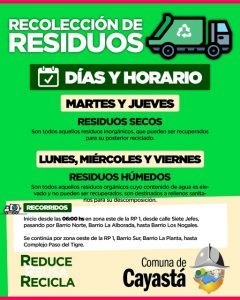Cayastá. Días y horarios de la Recolección Diferenciada de Residuos