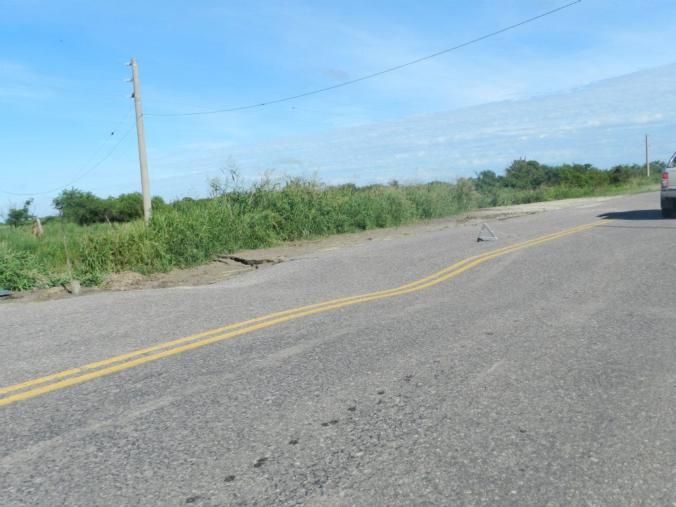 Según técnico de Vialidad, la carpeta asfáltica cedió varios centímetros, además al agua socavó los laterales de la alcantarilla. Personal de la zona IV trabaja en el lugar para frenar la erosión y tratar de salvaguardar la estructura de la alcantarilla.