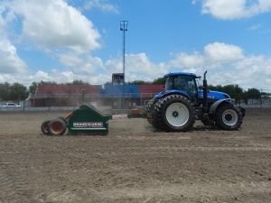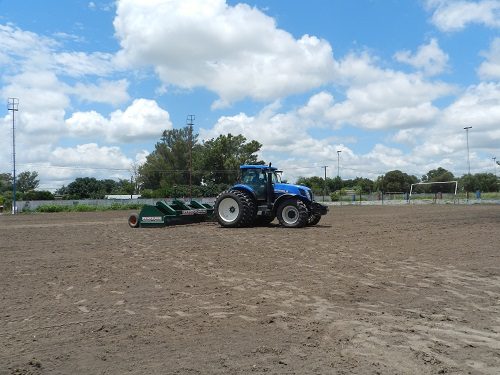 El ambicioso proyecto de mejorar las condiciones del suelo y césped de la cancha de fútbol, la empresa Trimacer se sumó a colaborar con el moderno equipo GPS para la nivelación de terrenos.