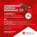 Se abordarán los temas “Convivencia democrática y Justicia. La Reforma Procesal Penal en Santa Fe”. Disertan: Martin Apiolaza, Héctor Superti, Matías Drivet y el cierre estará a cargo de Raúl Lamberto.