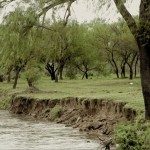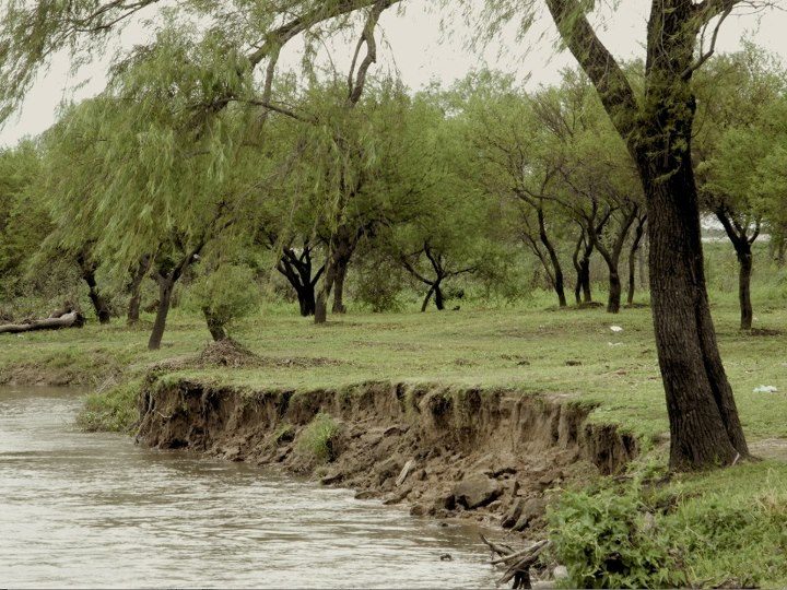 b) Erosión: Perceptible fundamentalmente en las zonas donde los meandros del curso forman barrancas, fundamentalmente en las cercanías del centro urbano, allí el cauce ha desmoronado al menos dos metros (perpendiculares al curso) de barranca en los últimos diez años. También es perceptible en las áreas aledañas a las explotaciónes areneras, dónde árboles jóvenes plantados en tierra firme han sido alcanzados por el agua.