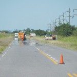 Personal de la Dirección Provincial de Vialidad trabajaba esta mañana en la señalización horizontal de la ruta de la costa, entre Saladero Cabal y El Laurel, departamento Garay.