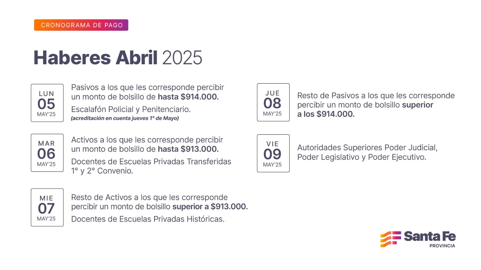 El Gobierno de la Provincia de Santa Fe, a través del Ministerio de Economía, informa que los trabajadores públicos percibirán sus salarios desde el lunes 5 de mayo (acreditado en cuenta desde este jueves), hasta el viernes 9.