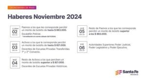 El Gobierno provincial, a través del Ministerio de Economía, informó que los haberes del mes de noviembre se percibirán a partir del lunes 2 de diciembre. La liquidación incluye el incremento acordado en paritarias, que para noviembre contempla un 3 % de aumento tomando como base los salarios de septiembre.