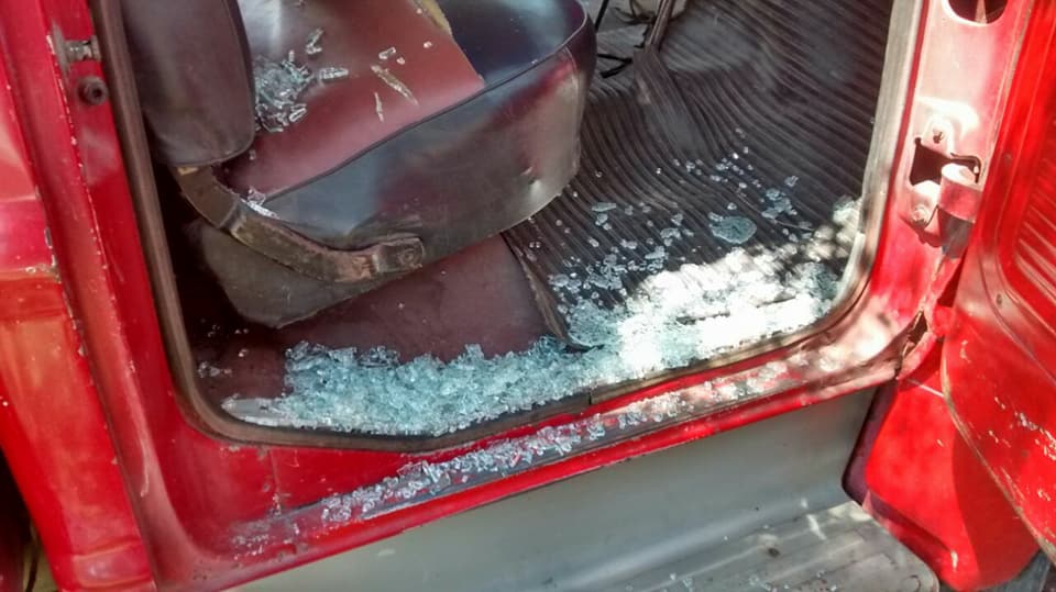 En el día de ayer, pasadas las 14hs en que se recibe un llamado por un incendio de campo, cerca del basural, y para brindarle apoyo al móvil 11 que se encontraba trabajando en el lugar, personal se aprestaba a salir en el móvil 07, estacionado debajo de un árbol que se encuentra en el patio de nuestro Cuartel, se escucha un estampido. Al subirse al móvil, observan que el vidrio de la ventanilla derecha había sido destruida por un cascote, piedra o aire comprimido de alguna persona que rápidamente se escondió o fugo…lamentable pero cierto….