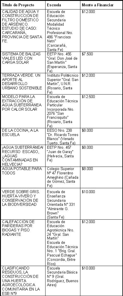 De acuerdo a los 10 proyectos seleccionados, estos corresponden a escuelas santafesinas de las localidades de Carcarañá, Esperanza, Rosario (2), Venado Tuerto, Helvecia, Cañada de Gómez y Santa Fe, a las que se sumaron Concordia (Entre Ríos) y General Rodríguez (Buenos Aires).