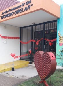 La directora Verónica Ojada y la vicedirectora Silvina Delfino comunicaron la colocación, frente al edificio escolar, de un corazón confeccionado en metal y que se utilizará para alojar las tapitas plásticas que están siendo recolectadas por la comunidad a través de la campaña que ellos denominaron “Corazón de Tapitas”.