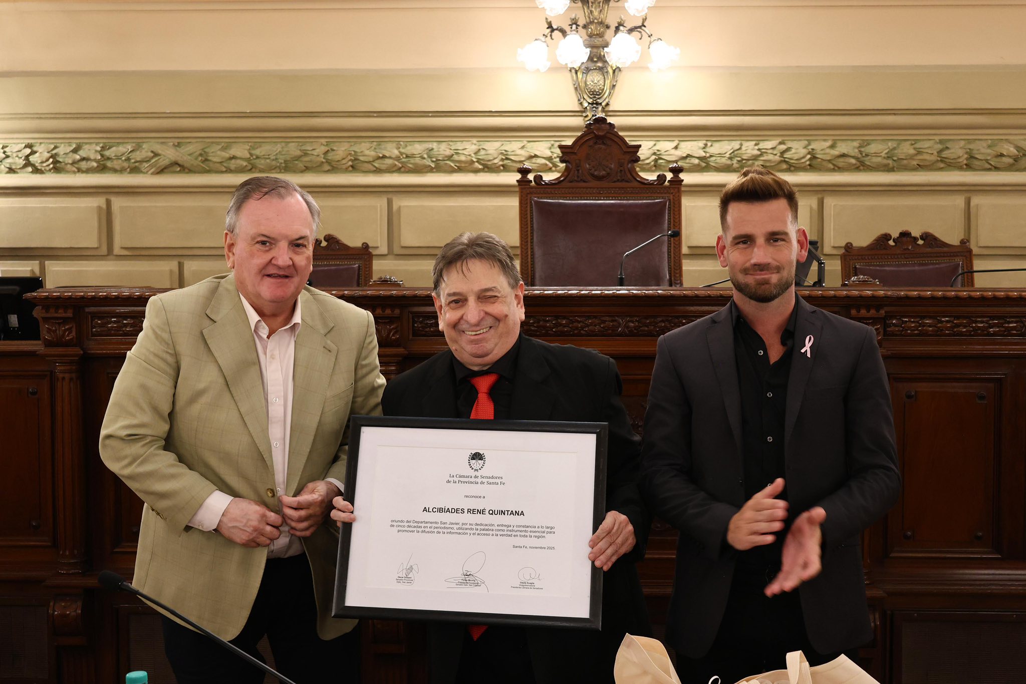 El acto se llevó a cabo en el recinto de sesiones de la Cámara de Senadores, donde legisladores y autoridades locales destacaron la extensa trayectoria de Quintana, un referente del periodismo regional y nacional.