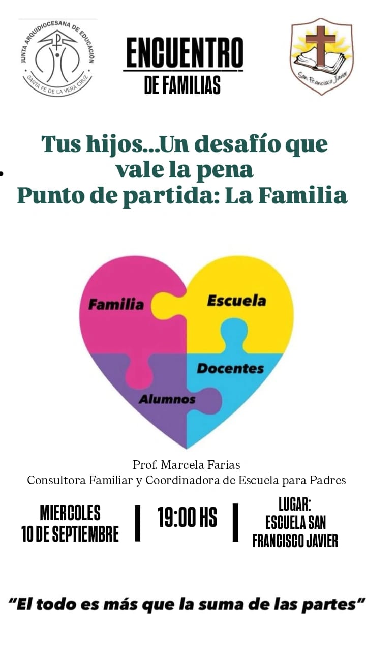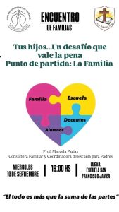 Este miércoles 10 de septiembre, a las 19:00 hs, se realizará en la Escuela San Francisco Javier el encuentro de familias titulado “Tus hijos… Un desafío que vale la pena. Punto de partida: La Familia”, a cargo de la Prof. Marcela Farías, consultora familiar y coordinadora de Escuela para Padres.