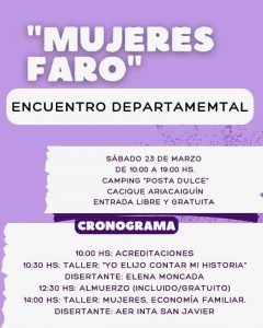 El cronograma de actividades incluye una variedad de propuestas enriquecedoras, comenzando con las acreditaciones a las 10:00hs. A las 10:30hs, se llevará a cabo el taller «Yo Elijo Contar Mi Historia», con la disertante Elena Moncada. Tras un almuerzo incluido y gratuito a las 12:30hs, a las 14:00hs se desarrollará el taller «Mujeres, Economía Familiar», a cargo de AER INTA San Javier. La tarde continuará con un senderismo de «Naturaleza & Historia» a las 15:30hs, seguido de actividades recreativas a las 16:30hs y un fogón de cierre a las 18:00hs.