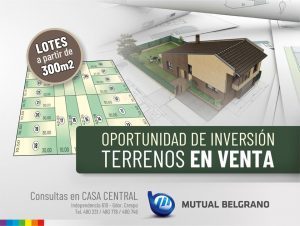 Desde Mutual Belgrano le ofrecemos la oportunidad de invertir a través de esta Venta de Terrenos de diferentes dimensiones, partiendo de lotes desde los 300 metros cuadrados en una excelente ubicación en Gobernador Crespo.