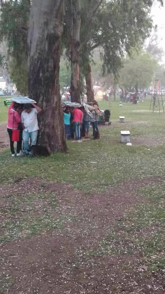Centenares de personas estaban participando de la Sexta Mateada Familiar, que se desarrollaba en el predio del Boulevard Candiotti, y se vieron afectados por el granizo y la lluvia cuando se estaba controlando los cartones ganadores del último sorteo.