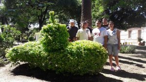 Alejandro Lanche junto a un grupo de jóvenes con capacidades especiales que se capacitaron en auxiliar en jardinería, le dieron forma de submarino a una planta de duranta en la plaza San Martín.