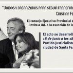Desde el Concejo de Unidad Básica del Partido Justicialista (San Javier) queremos hacer amplia la invitación a la asunción de las nuevas autoridades provinciales del PJ, dicho acto se desarrollara el día 18 de junio a las 18hs en la sede del partido justicialista, crespo 2358 de la ciudad de Santa Fe. » queremos que todos aquellos que son y serán parte de este movimiento nacional y popular sean parte del mismo desde el lugar que ocupen».