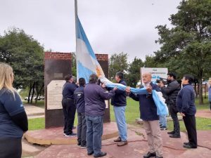 En la plaza Adolfo Mecca de San Javier, bajo una tenue llovizna se realizó el izamiento de la bandera en honor al 42° aniversario de la Guerra de Malvinas, al no poderse realizar el acto como estaba previsto por cuestiones climáticas.
