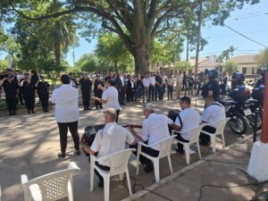 El acto, realizado frente a la jefatura policial, contó con la presencia de la Secretaria de Gestión Institucional del Ministerio de Justicia y Seguridad de Santa Fe, Virginia Coudanes, el senador Oscar Dolzani, autoridades locales, jefes policiales y la comunidad en general.