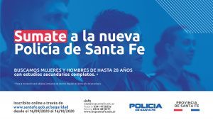El gobierno provincial, a través del Ministerio de Seguridad, abre la inscripción para la carrera de Técnico Superior en Seguridad Pública y Ciudadana para formar parte de la Policía de la provincia de Santa Fe. La inscripción se encuentra vigente desde el 16 de septiembre y se extenderá hasta el 16 de octubre de 2020. Se busca incorporar varones y mujeres de entre 18 a 28 años de edad, que tengan el secundario completo, y que cumplan con los requisitos planteados por la institución.