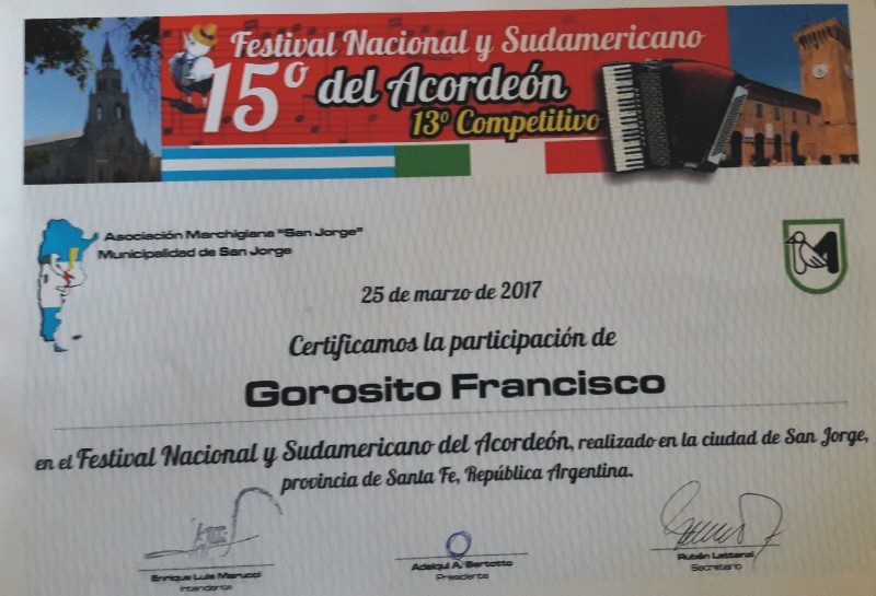 “La organización también nos trató de mil maravillas. Pudimos saludar al Chango Spasiuk y a muchos artistas conocidos, pero también a una gran cantidad de colegas acordeonistas de muchos países” concluyó Lilo, quien exhibió en conferencia de prensa, el diploma correspondiente que certifica su participación.