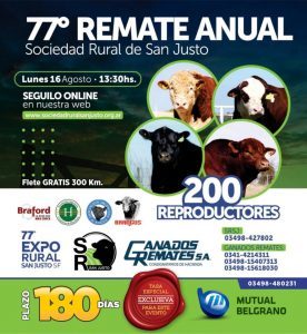 Mutual Belgrano estará financiando el 77° Remate Anual de la Sociedad Rural de San Justo. En la oportunidad se contará con un plazo de 180 días y una tasa especial y exclusiva para este evento. El remate se desarrollará el día lunes 16 del corriente desde las 13:30 horas y se estarán subastando 200 reproductores. Además se podrá seguir on line en la web: www.sociedadruralsanjunto.org.ar  para quienes así lo deseen. Para interiorizarse sobre nuestras herramientas financieras  podrán consultar en las Filiales de Mutual Belgrano o al teléfono 480231
