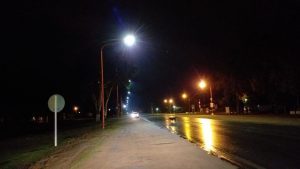 La línea de iluminación de extiende de la intersección de las rutas hasta el ingreso a Barrio Santa Rosa por calle Presidente Perón. Se planea continuar con las obras hacia el sur.
