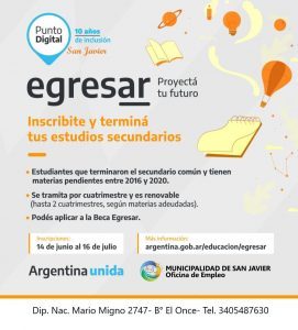 Dicho programa propone una beca de 5 mil pesos mensuales por cada cuatrimestre. Quienes deseen acceder a esta herramienta pueden inscribirse por los canales oficiales en https://www.argentina.gob.ar/educacion/egresar o, acercarse por Punto Digital, ubicado en barrio El Once. Sino contactarse al 03405 – 154 87 630 en horas de la mañana.