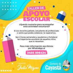 El Gobierno Comunal de Cayastá y la Fundación Julio Migno se complacen en anunciar el lanzamiento de un emocionante proyecto de voluntariado destinado al apoyo escolar en nuestra localidad. Esta iniciativa tiene como objetivo principal brindar acompañamiento y asistencia educativa a estudiantes de diferentes niveles, promoviendo así el acceso igualitario a la educación y el desarrollo integral de los niños y jóvenes de nuestra comunidad.