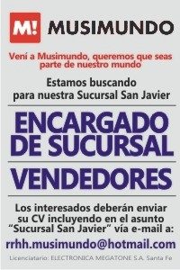 Musimundo busca encargado de sucursal y vendedores para la sucursal San Javier. Los interesados deberán enviar su CV incluyendo en el asunto “Sucursal San Javier” vía e-mail a rrhh.musimundo@hotmail.com