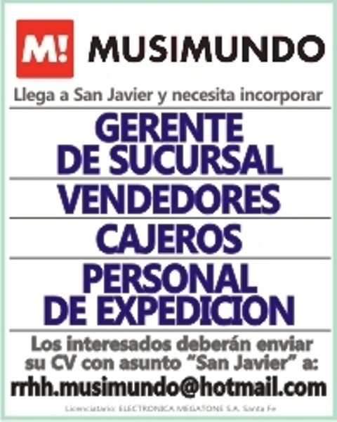 MUSIMUNDO_BANNER_SAN_JAVIER_200X250MUSIMUNDO llega a San Javier y necesita incorporar: gerente de sucursal, vendedores, cajeros y personal de expedición. Los interesados deberán enviar su CV con asunto “San Javier” a: rrhh.musimundo@hotmail.com
