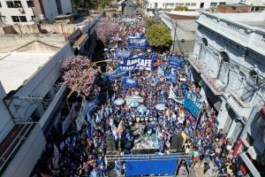 Pero también tenemos un tercer desafío que es quizás el más importante, y es lo que pretendió hacer el gobierno. Cómo les molesta la AMSAFE, cómo les molesta las compañeras y compañeros en la calle, cómo les molesta esta democracia, esta participación , cómo les molesta nuestra contundencia, nuestro tercer desafío es que hay que mantener la fortaleza de este sindicato, la unidad de la AMSAFE, tenemos todos juntos que seguir peleando, como dijo la compañera estudiante que tomó la palabra, como dijeron Graciela y la Chini, en unidad tenemos que salir, pero también con fortaleza, porque estamos en cada escuela, con esa fortaleza que tenemos cuando nos ponemos el guardapolvo, con esa fortaleza que tenemos cuando salimos a la calle y con esa fortaleza venderemos el unes, queremos una nueva propuesta paritaria nada de descuentos, mucha fuerza compañeras y compañeros, que viva la escuela pública y que viva la lucha de las trabajadoras y trabajadores de la educación.”