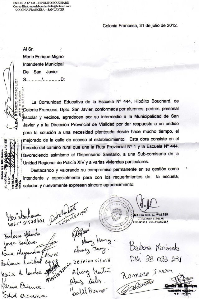 La Municipalidad de San Javier quiere hacer pública la nota recibida el pasado 31de julio de parte de la Escuela Nº 444 «Estela Bouchard» de Colonia Francesa y vecinos de dicha colonia respecto a la obra de colocación de fresado asfáltico en caminos vecinales. Adjuntamos copia de la nota.