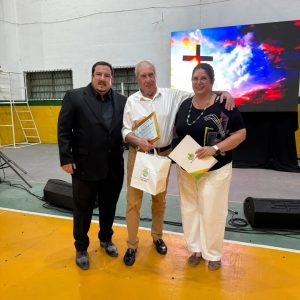 En la cena en honor a nuestro santo patrono San Francisco Javier, el secretario de Cultura y Educación, Fernando Vázquez, junto a Ángela Ríos, coordinadora de Vinculación Institucional, entregaron un reconocimiento especial a Hugo Daniel “Drako” Giuria, creador del escudo oficial de la ciudad hace ya 55 años.