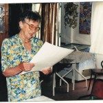 Año 1998 Amanda Caballero leyendo un pergamino entregado por ex alumnos en los festejos de las Bodas de Oro de la promoción 1948 de la Escuela Nº 422