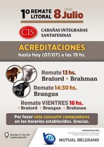 Se solicita a los Medios que deseen cubrir el remate Litoral pre-acreditarse ya que deberán cumplimentar con diferentes medidas de seguridad y control, así mismo les recordamos que podrán permanecer en el predio y realizar su tarea hasta la hora 13. Esto guarda una estrecha relación con el Protocolo y acciones tendientes a preservar aspectos organizativos, ya que a esa hora los cupos de presencias serán destinados a los productores que participan del remate.