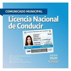 La Municipalidad de Romang informa que el próximo miércoles 05 y jueves 06 de Agosto, a las 19:00 horas en la Sala Municipal de Cultura, se dictarán conferencias teóricas para personas que van a obtener la Licencia de Conducir por primera vez y también para quienes cambiaran de categoría de Licencia de Conducir. La misma tendrá un cupo, lo cual deberán inscribirse previamente llamando al 496899
