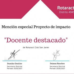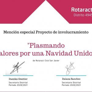 Rotaract San Javier recibió este fin de semana doble mención por dos proyectos de la institución. Los mismos son «Docente Destacado» y «Plasmando valores por una navidad unidos», ambos fueron destacados por el distrito 4945 entre 15 clubes y más de 100 proyectos.