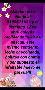 Por iniciativa de la Comuna de esa localidad, entre esta semana y la siguiente podés mandarle tu dibujo al conejo de pascua con tu nombre y apellido y él te entregará un regalo para que lo disfrutes en la comodidad de tu hogar,  estaremos recibiendo los dibujos al teléfono 3405511681 vía WhatsApp. ¡Para todos los chicos de Saladero el domingo 12!!!